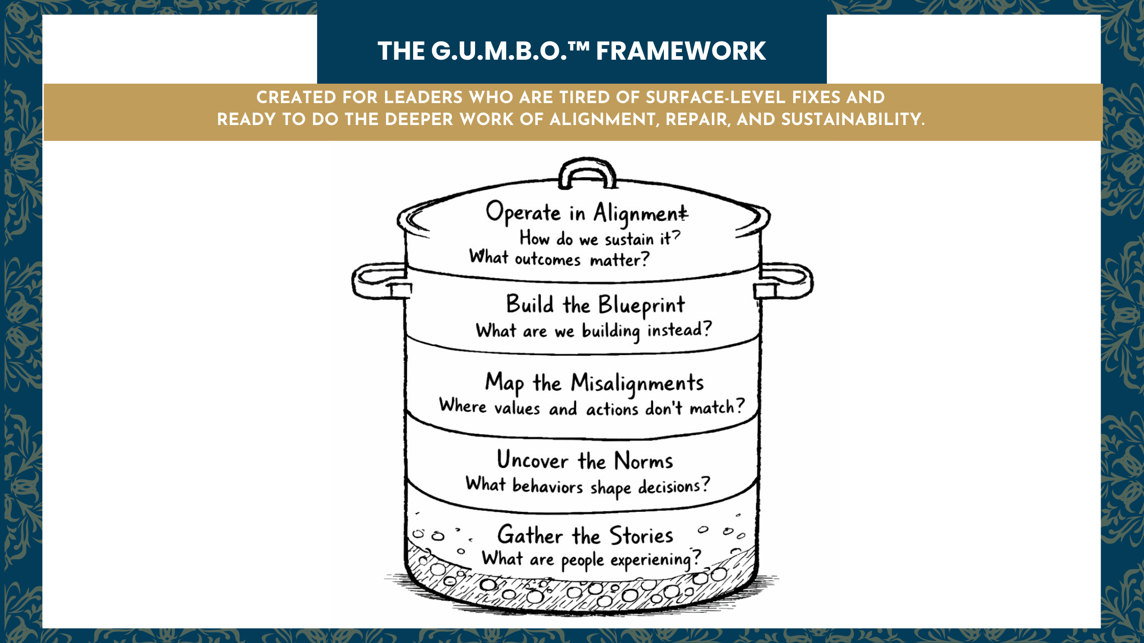 Our coaching partnerships are guided by the G.U.M.B.O. Framework—a practical approach that helps individuals and organizations move from surface-level fixes to sustainable alignment.